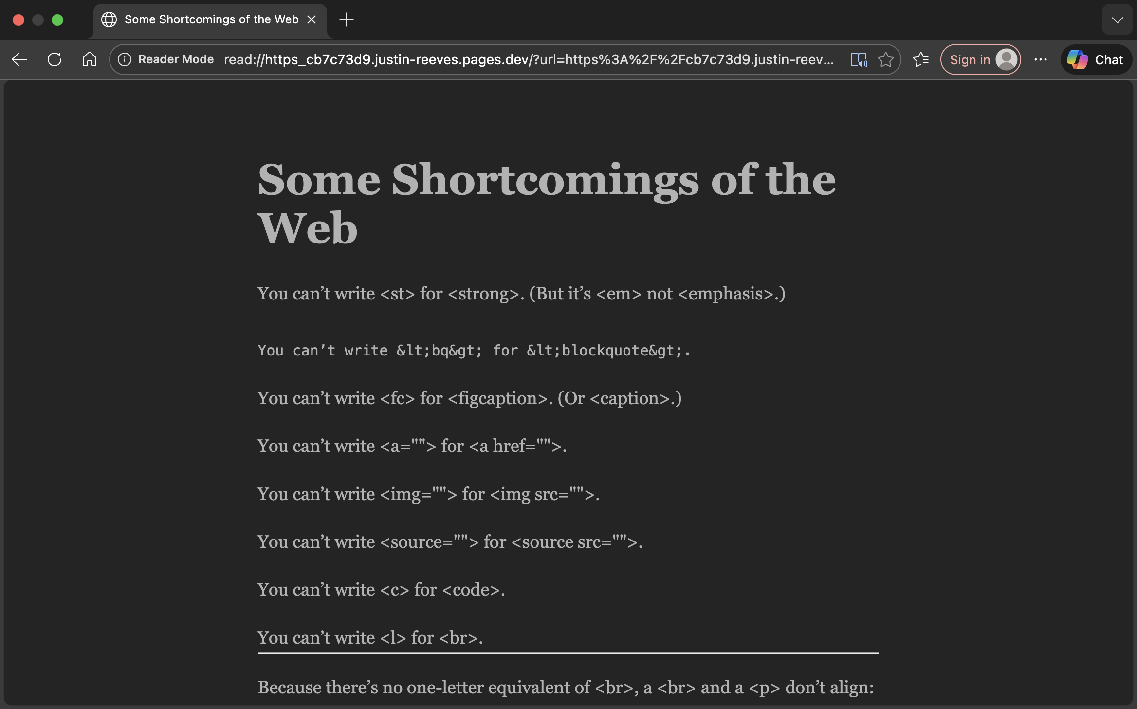 Safari’s reader isn’t “available” on pages (like this one) with “too many” <hr>.